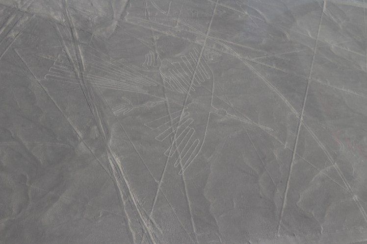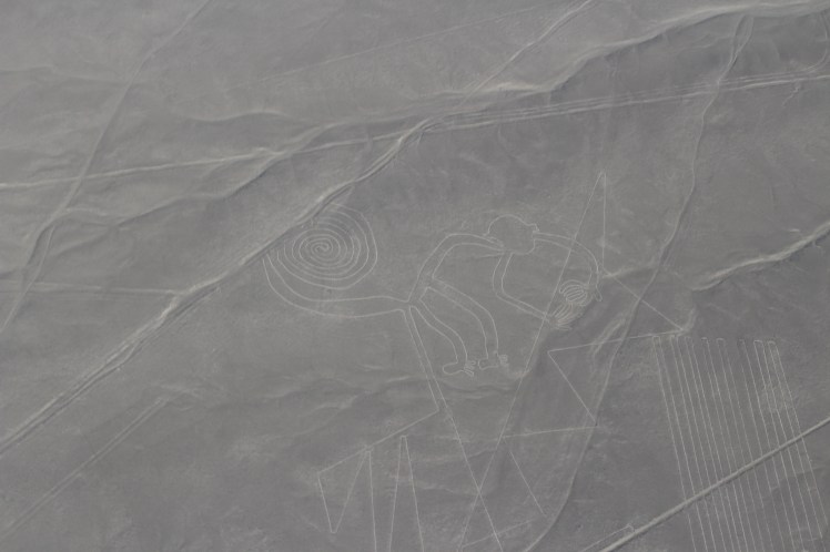 Ce que l’on appelle les lignes de Nazca, ce sont des géoglyphes, c’est à dire de grands dessins tracés sur le sol dans le désert péruvien, représentant souvent des animaux (le singe, le colibri), des objets ou de grandes formes géométriques.