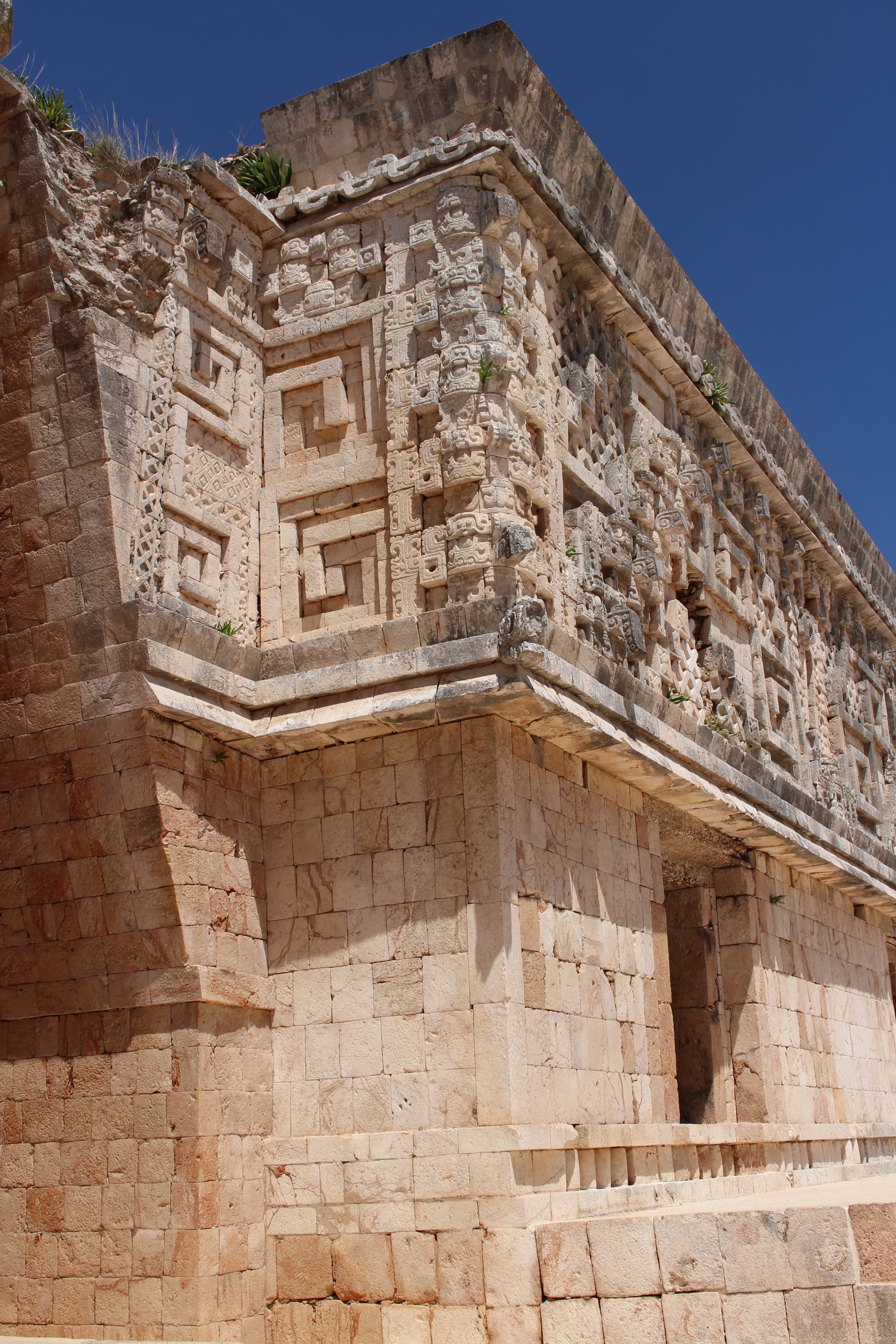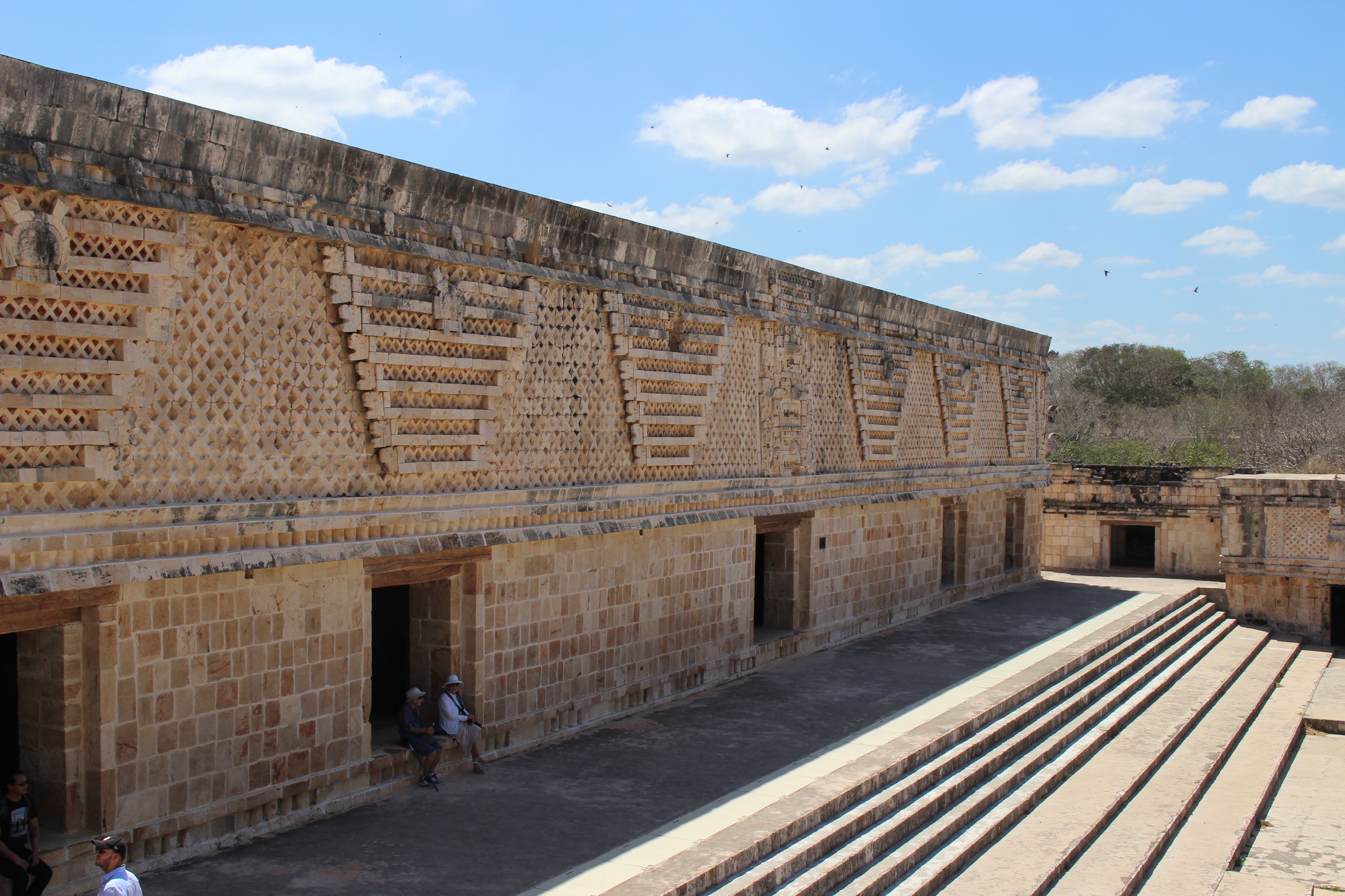 Le site d’Uxmal, ne ressemble pas aux deux premiers que nous avons vus (Chichen Itza et Ek Balam). Il se différencie notamment par son architecture du style Puuc qui se caractérise par de longs bâtiments dont la partie inférieure est assez sobre, et la partie supérieure très ornementée avec des frises très finement sculptées.