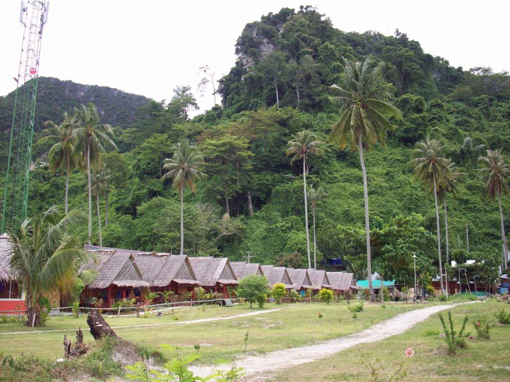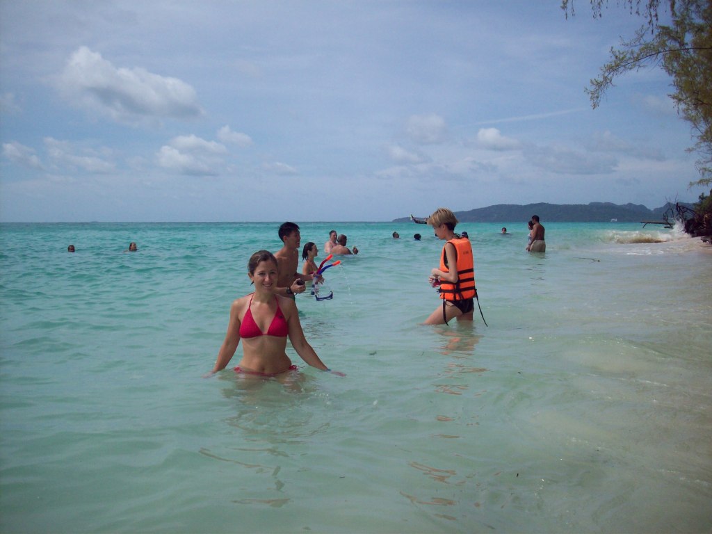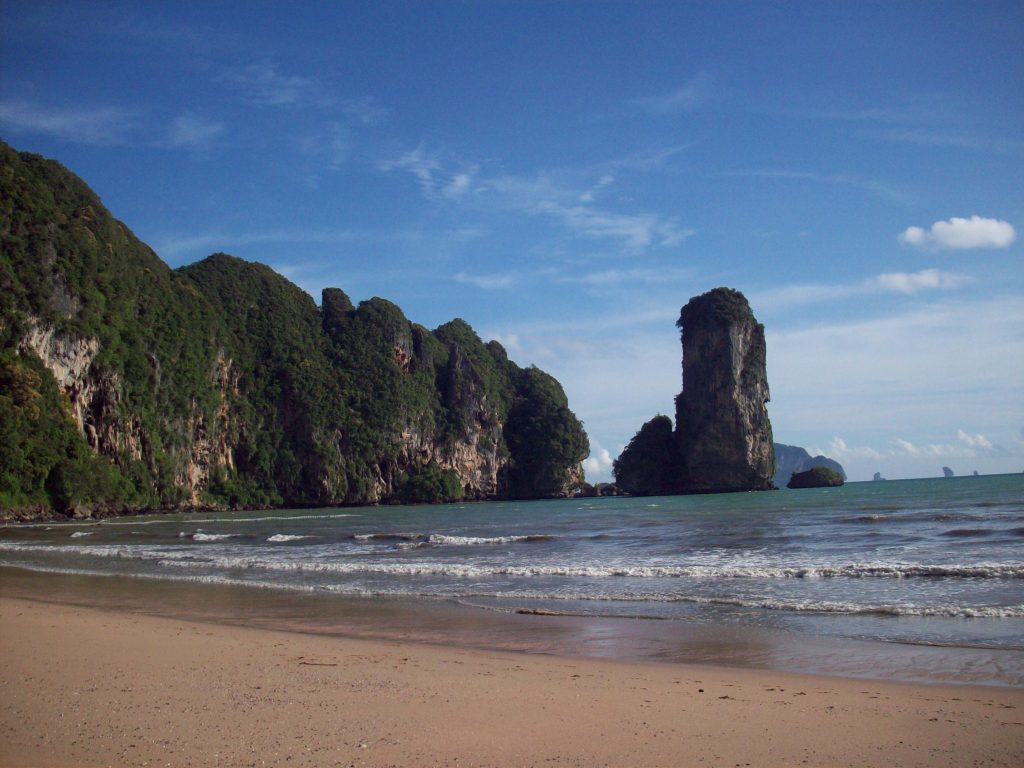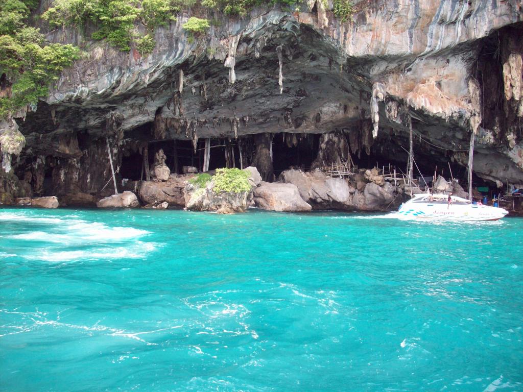 Après la pause baignade bien agréable, nous repartons en direction de Koh Phi Phi. En chemin nous passons devant la grotte de vikings, où nous faisons une pause photos, et nous faisons escale à Monkey Beach. La plage est jolie, mais pas très grande, et surtout envahie de singes. J’avoue que depuis ce jour je me méfie des singes, et ne les trouve pas si sympa que ça. Nous avons vu une fille se faire piquer son sac par un des singes, elle avait tous ses papiers dedans… Finalement elle finit par le récupérer, mais non sans mal. Nous repartons ensuite vers Koh Phi Phi Don où nous déjeunons et profitons d’un temps libre pour circuler sur l’île, et même faire bronzette.