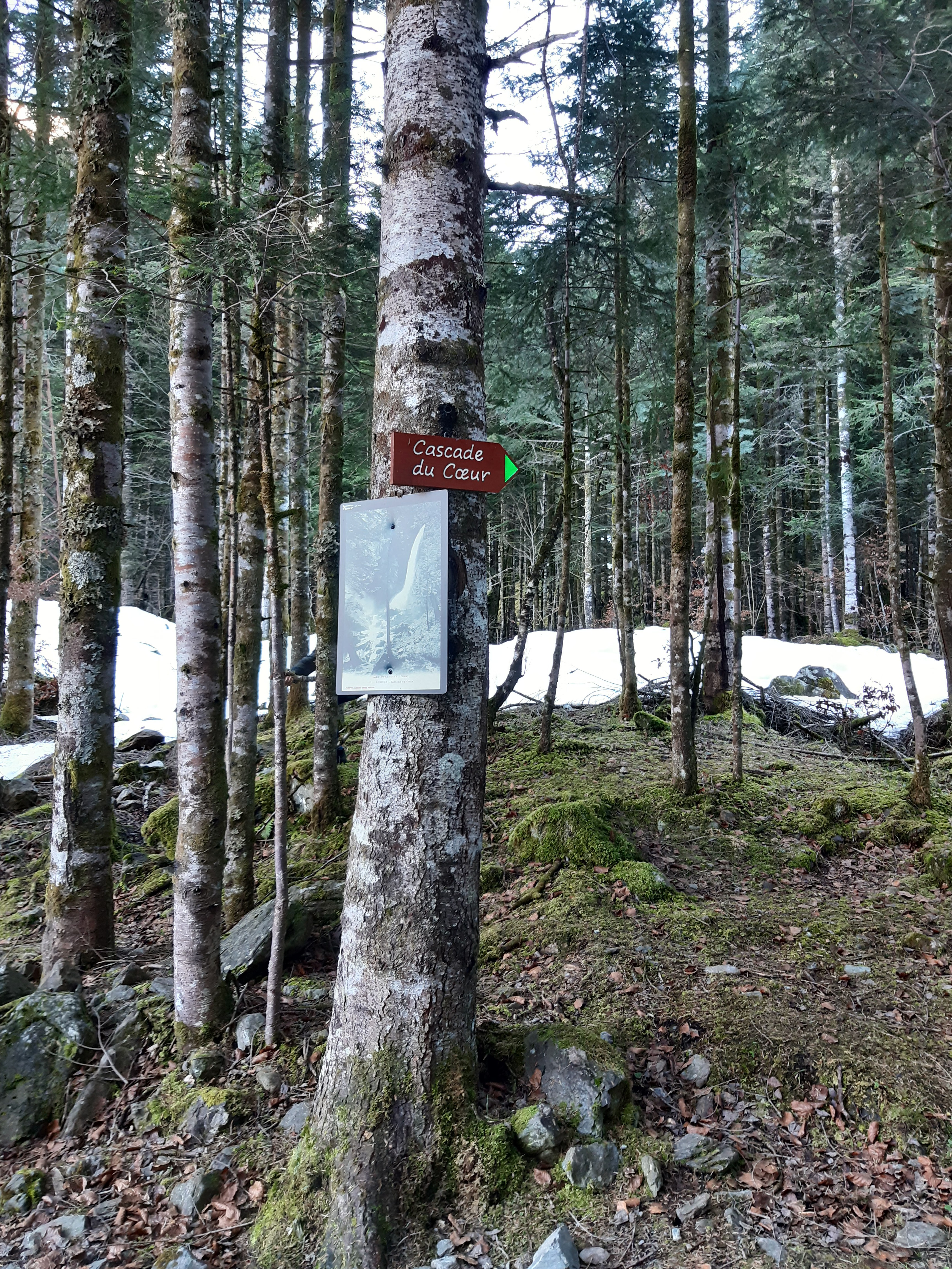 Nous reprenons ensuite notre balade en empruntant le sentier qui longe la centrale électrique. Après quelques mètres, nous tombons sur un panneau indiquant la cascade du cœur.