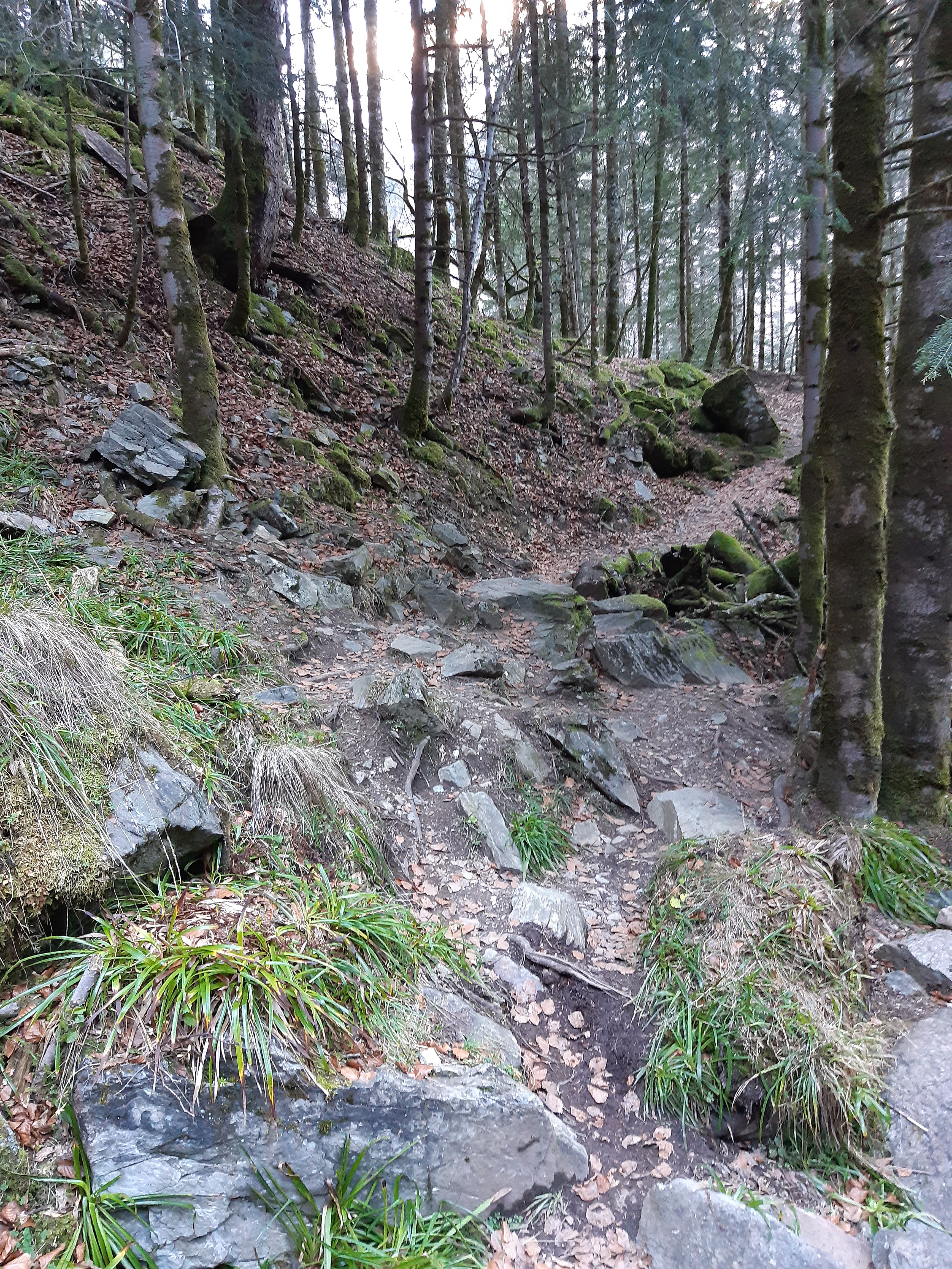 Nous suivons donc cette direction qui nous amène dans un passage forestier très agréable, avec un léger dénivelé positif.