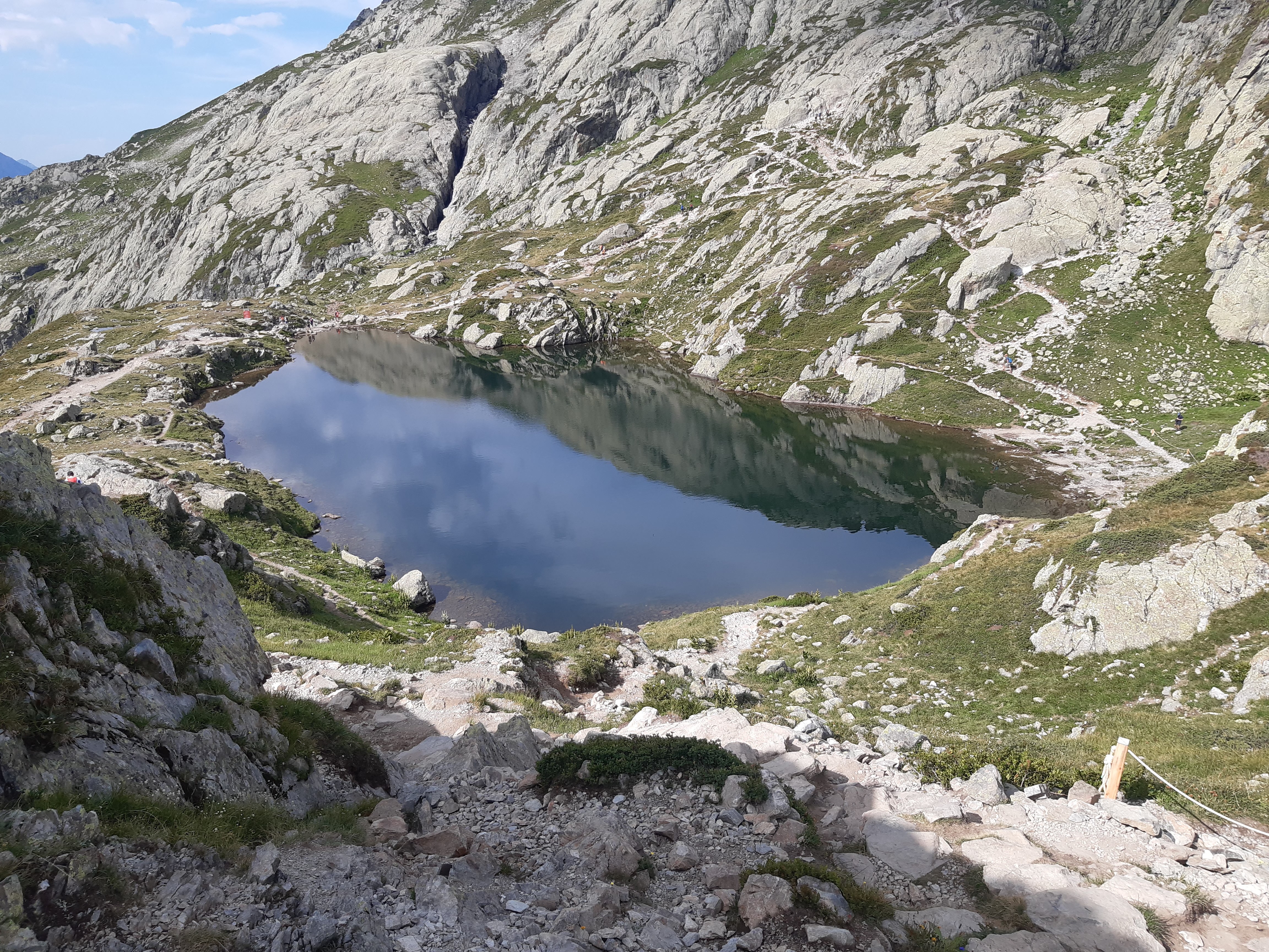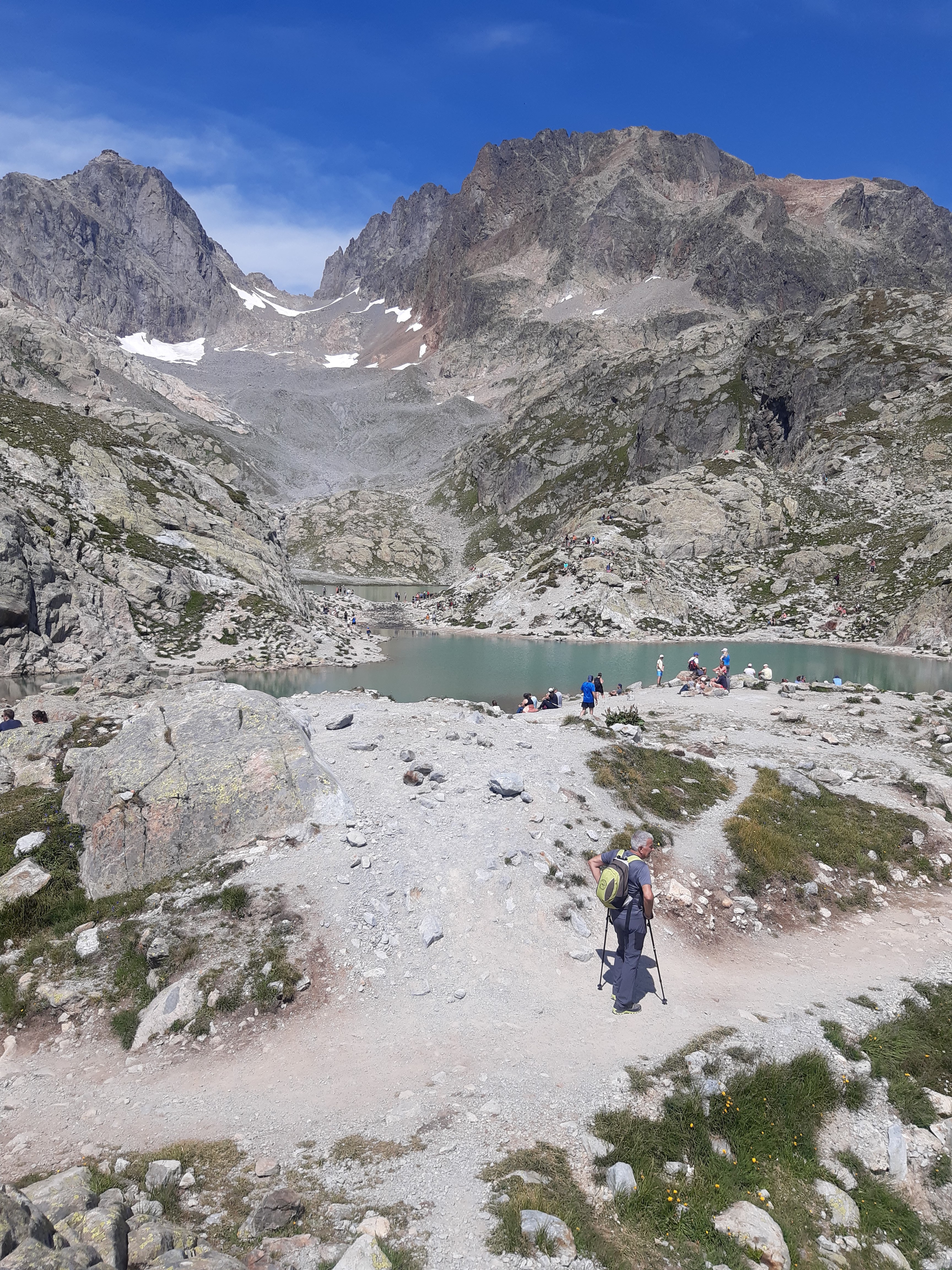 Après ce passage qui est le plus compliqué, on continue de monter jusqu’à atteindre les lacs des Chézerys. Il y en a 3. On passe d’abord devant les 2 plus petits et un peu plus loin le 3ème qui est plus grand. Auparavant il était possible de s’y baigner, ou du moins se rafraîchir car l’eau est fraîche, mais cela est désormais interdit.