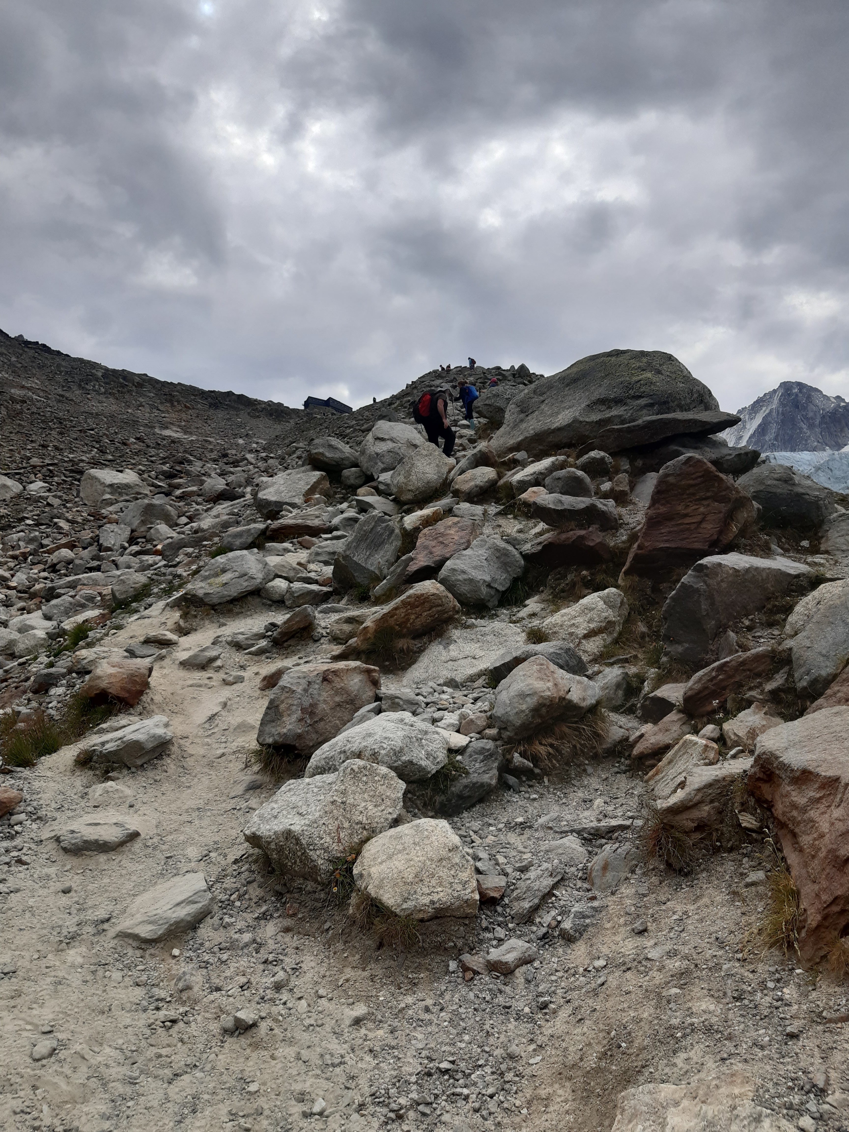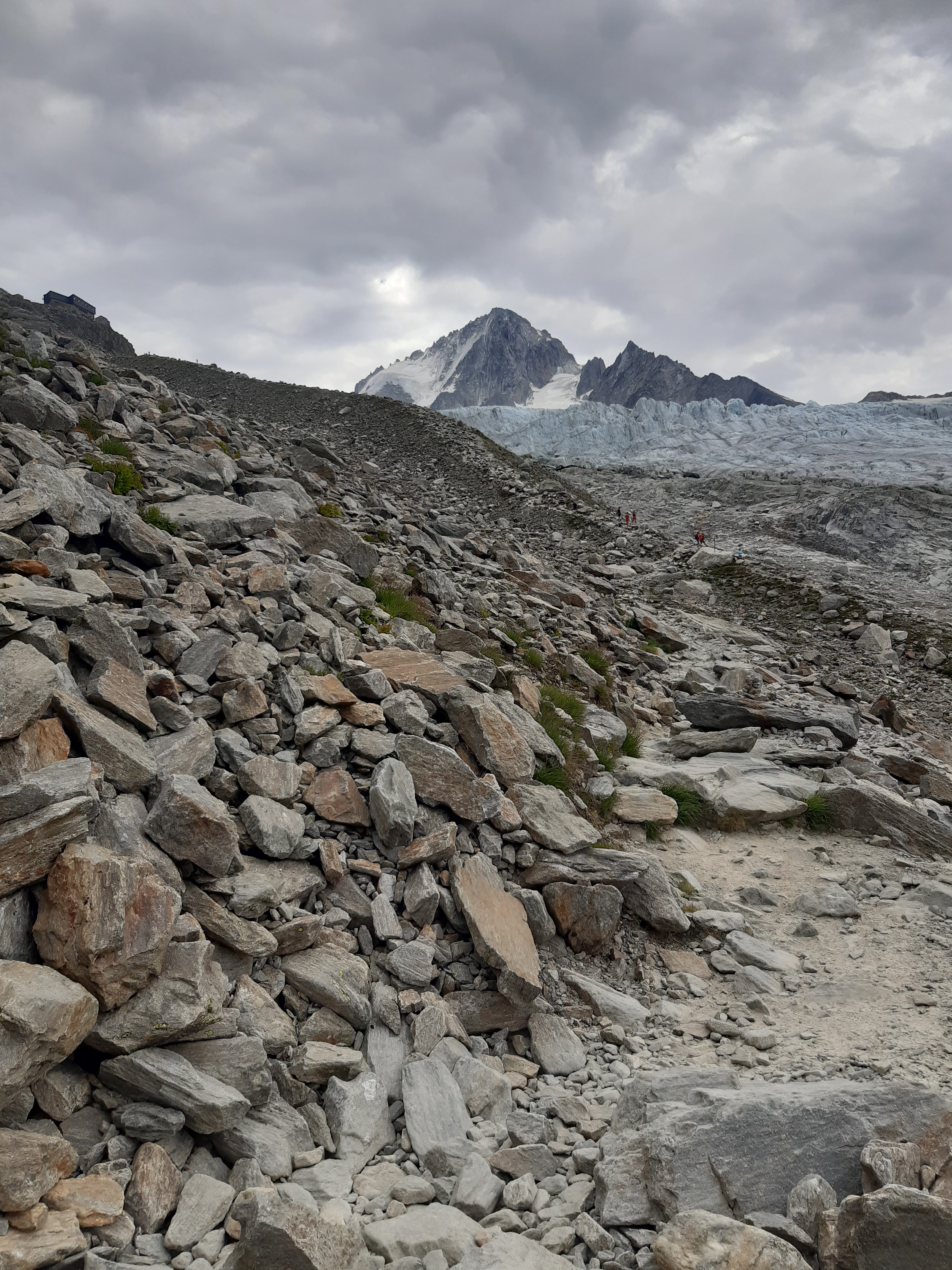La dernière montée dans la moraine est rude jusqu’à l’arrivée au refuge Albert 1er, mais la récompense est là ! En effet ce refuge se trouve juste au-dessus du glacier du tour que l’on a pu admirer tout le long de l’ascension, et on peut également y observer les aiguilles du Chardonnet et du Tour.