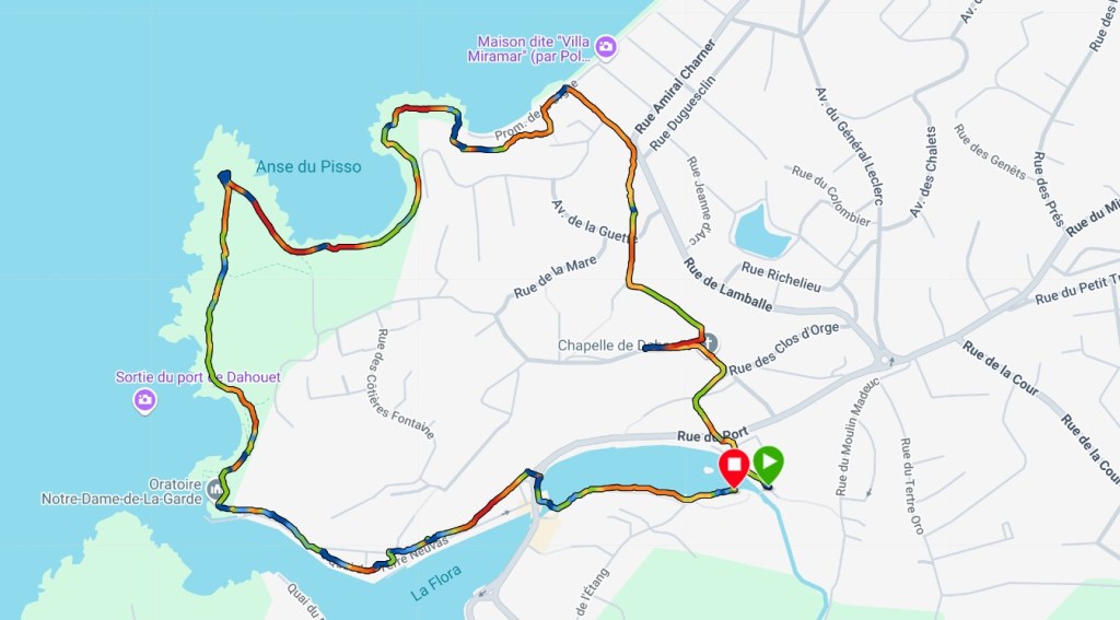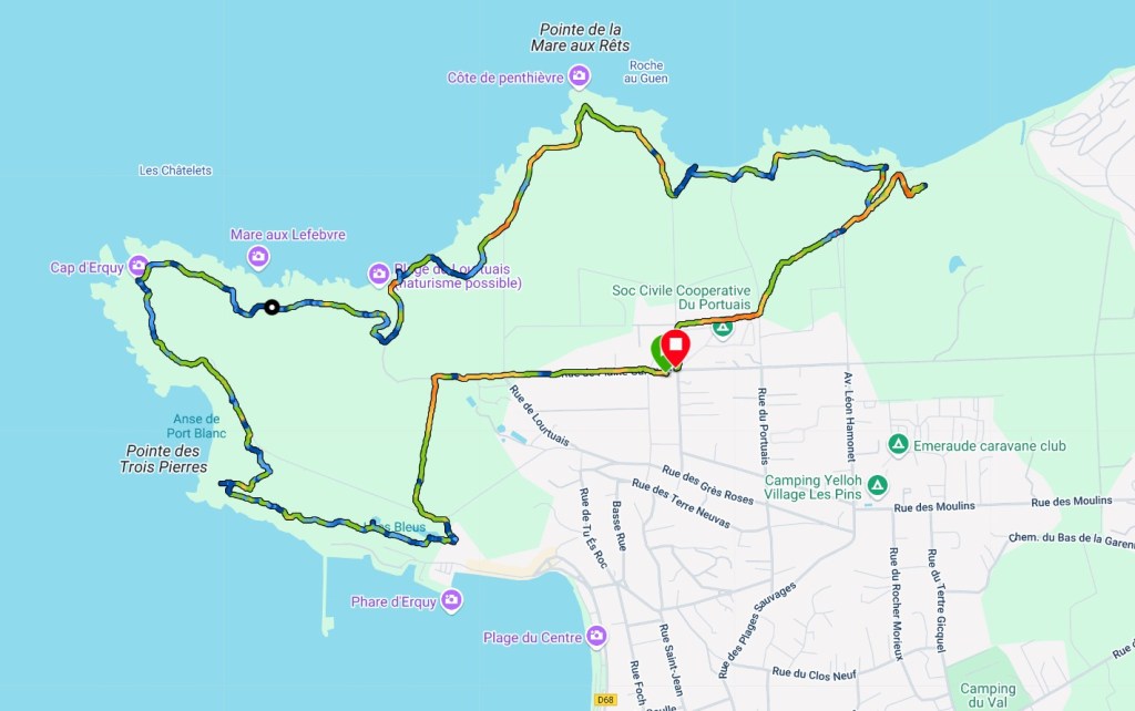 Après notre balade à Erquy, nous sommes descendus sur Pléneuf Val André où j’avais repéré une autre petite balade à faire. C’est une boucle de 3,5 km qui se fait en un peu moins d’1h.