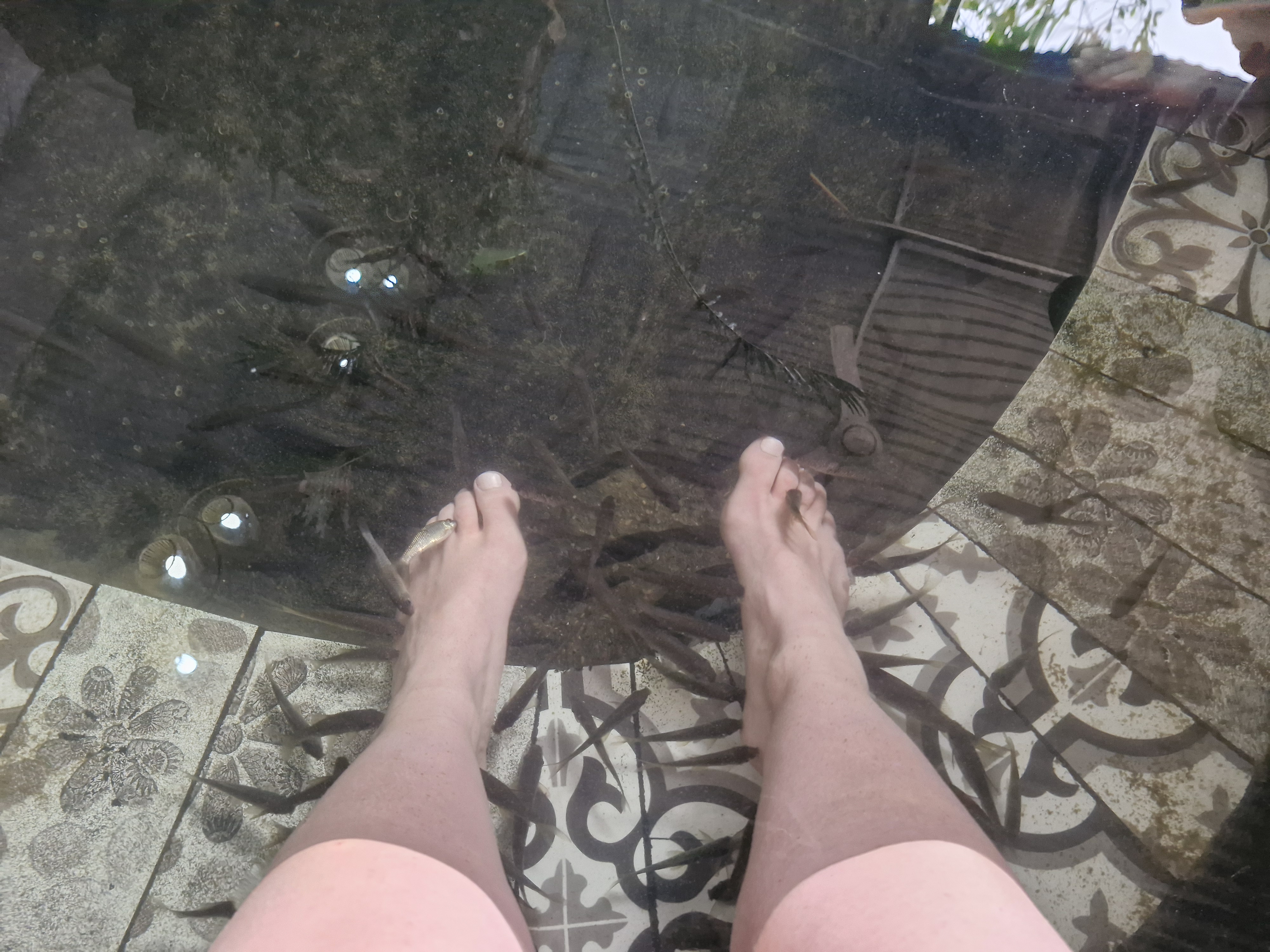 Ensuite, nous avons été invités à faire un massage des pieds avec des petits poissons, ainsi qu’à découvrir à quoi ressemblaient les maisons typiques (très rudimentaires).