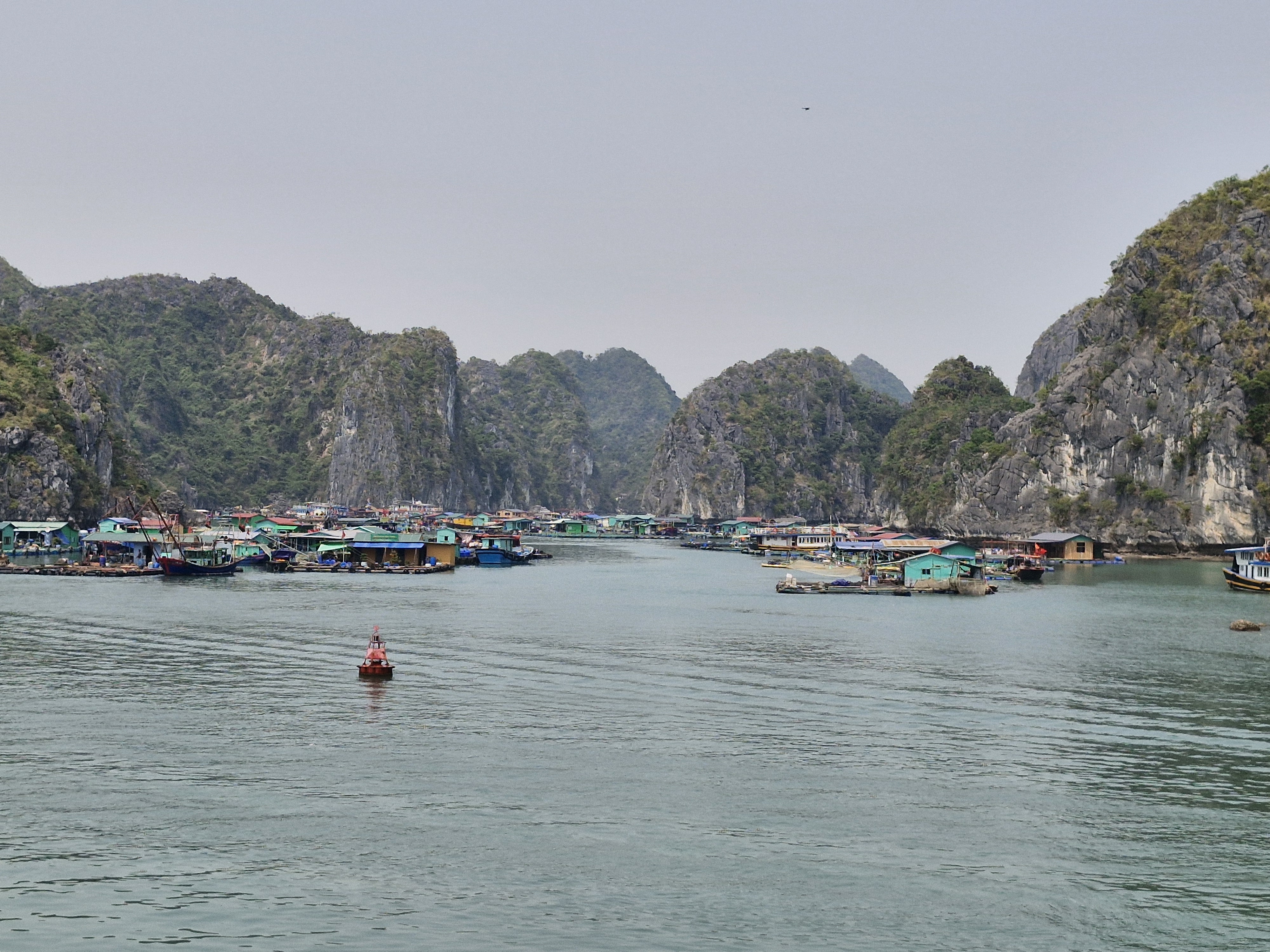 Nous sommes partis depuis Hanoi avec un mini-bus jusqu’à l’île de Cat Hai où nous avons pris un ferry (assez rudimentaire) tout en restant dans le bus, pour atteindre le nord ouest de l’île de Cat Ba. La traversée dure à peine 15 min. Et nous avons continué la route en bus (environ 30 min) pour rejoindre le petit port de Cai Beo, d’où partent certaines croisières.