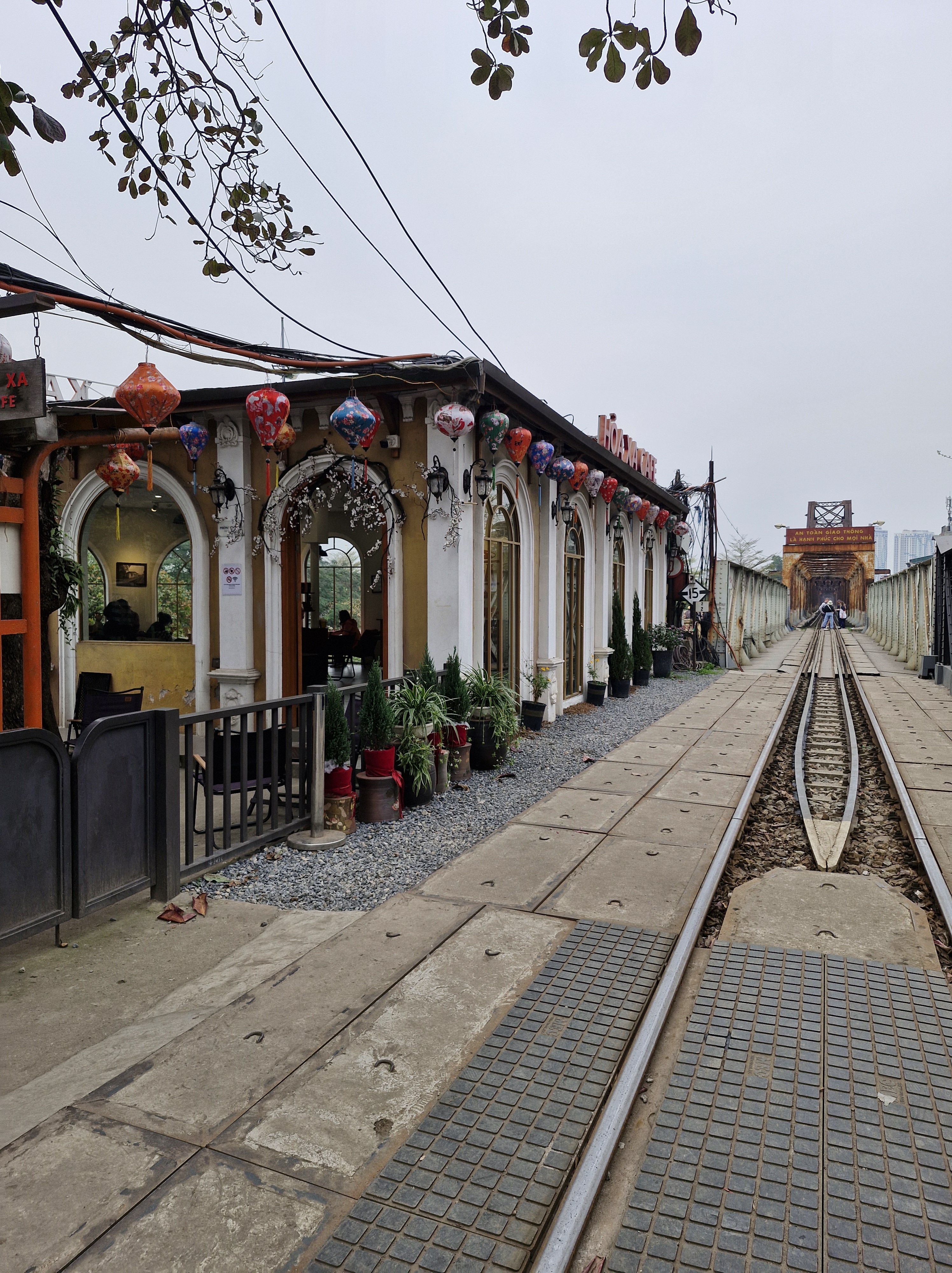 En poursuivant encore un peu plus au nord après le grand marché, on arrive au pont Long Biên, à côté de la gare du même nom, accessible aux 2 roues, aux piétons et au train, mais pas aux voitures.